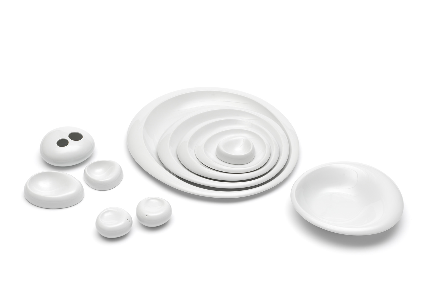 Inspiriert vom Welleneffekt, den Tropfen auf einer glatten Wasseroberfläche auslösen, fügen sich die verschiedenen Teller ineinander und scheinen dabei auf dem Tisch zu schweben. Tassen und Schalen laden wie Handschmeichler dazu ein, ihren Gebrauch mit allen Sinnen zu genießen. Accessoire-Teile wie Salz- und Pfefferstreuer, Vase, Gießer oder Dips wirken wie Fundstücke aus einem Flusslauf, die von den Elementen und der Zeit prägnant geformt wurden.